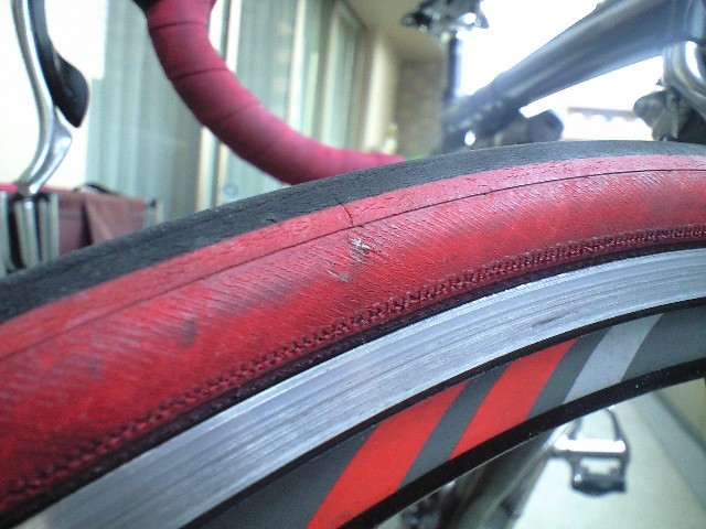 破れかぶれな状態のタイヤ。ミシュランPRO2。レース用のタイヤだけに日常で使うような耐久性は低いか。レースでの一発勝負で性能を発揮しきるスペックなんだろうから、それを日常の練習で使うのはお金に余裕のある人、かな。ちょうど自分も、耐久性、対パンク性能、価格、グリップ、など、日常の練習でつかうタイヤとしてどれがいいのか迷っていたところ。特に対パンク性能は気になるところ。遠出もするし、パンクはできるだけ少ない方がいい。そんな会話をFANTICさんと。で、FANTICさんが履いていたミシュランLITHIONの話題に。