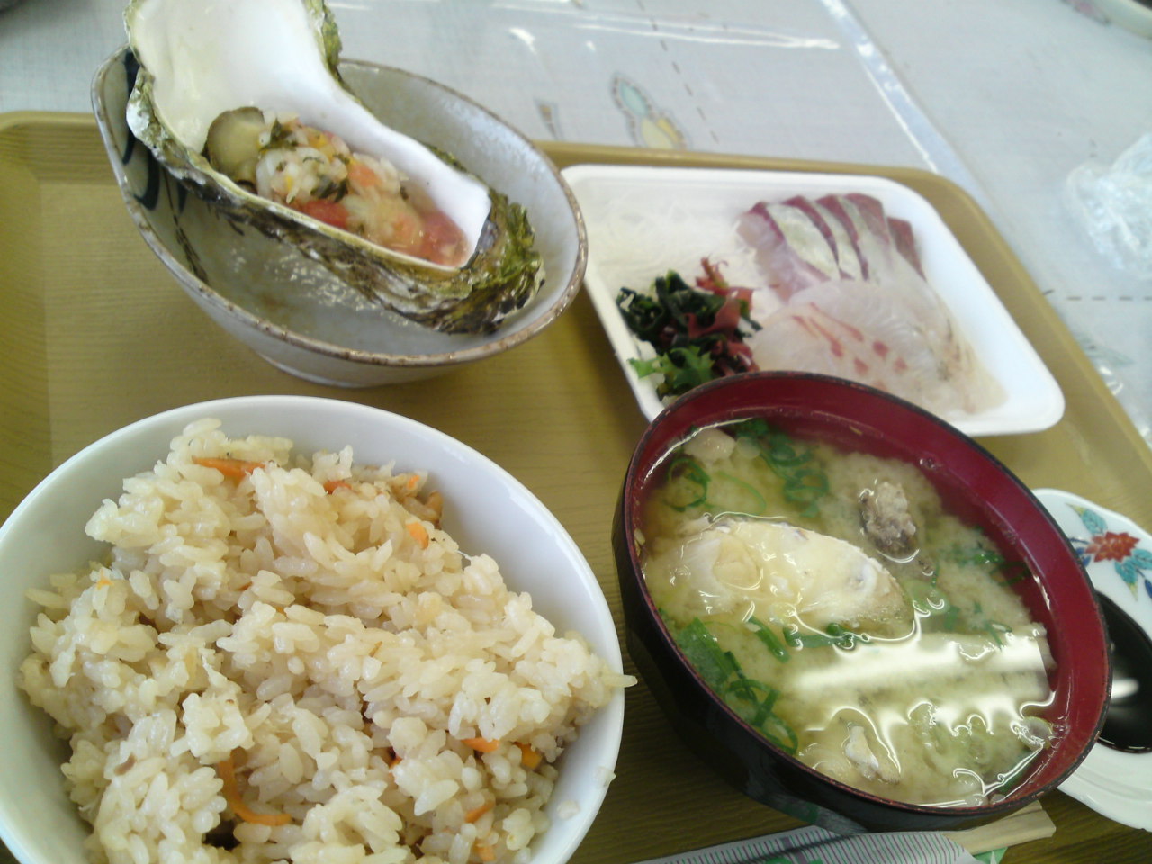 旨い!ぜんぶ旨いが、魚のアラで出汁をとった合わせ味噌のみそ汁がたまらない。もちろん、チヌ飯、新鮮な刺身、牡蠣、全て旨い。島ライドの醍醐味だ。みそ汁をおかわり。最後に温かいお茶をいただく。