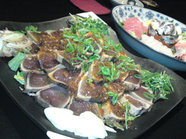 鰹のたたき、刺身の盛り合わせ、手羽先、ステーキなどなど、とても美味しい料理が所狭しと並んでいく。生ビールがプレミアムモルツ、というのもGood。旨い。