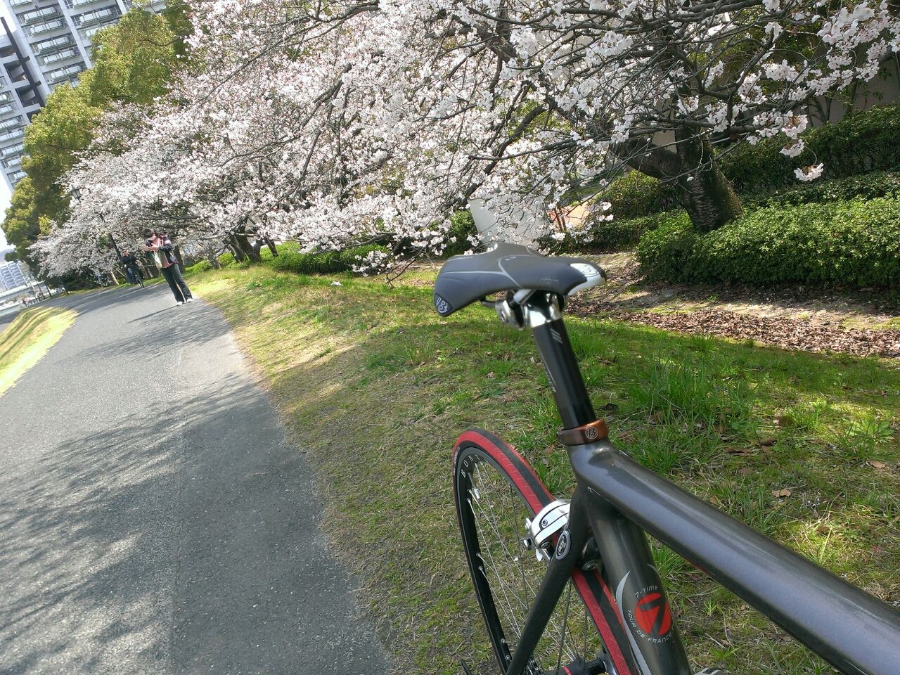 ちょうど桜の季節で川土手を流しながら花見ライド。
