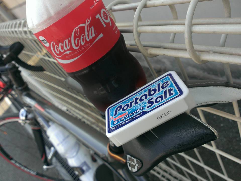 コーラとともにポータブルソルトを口にして身体をケアする。